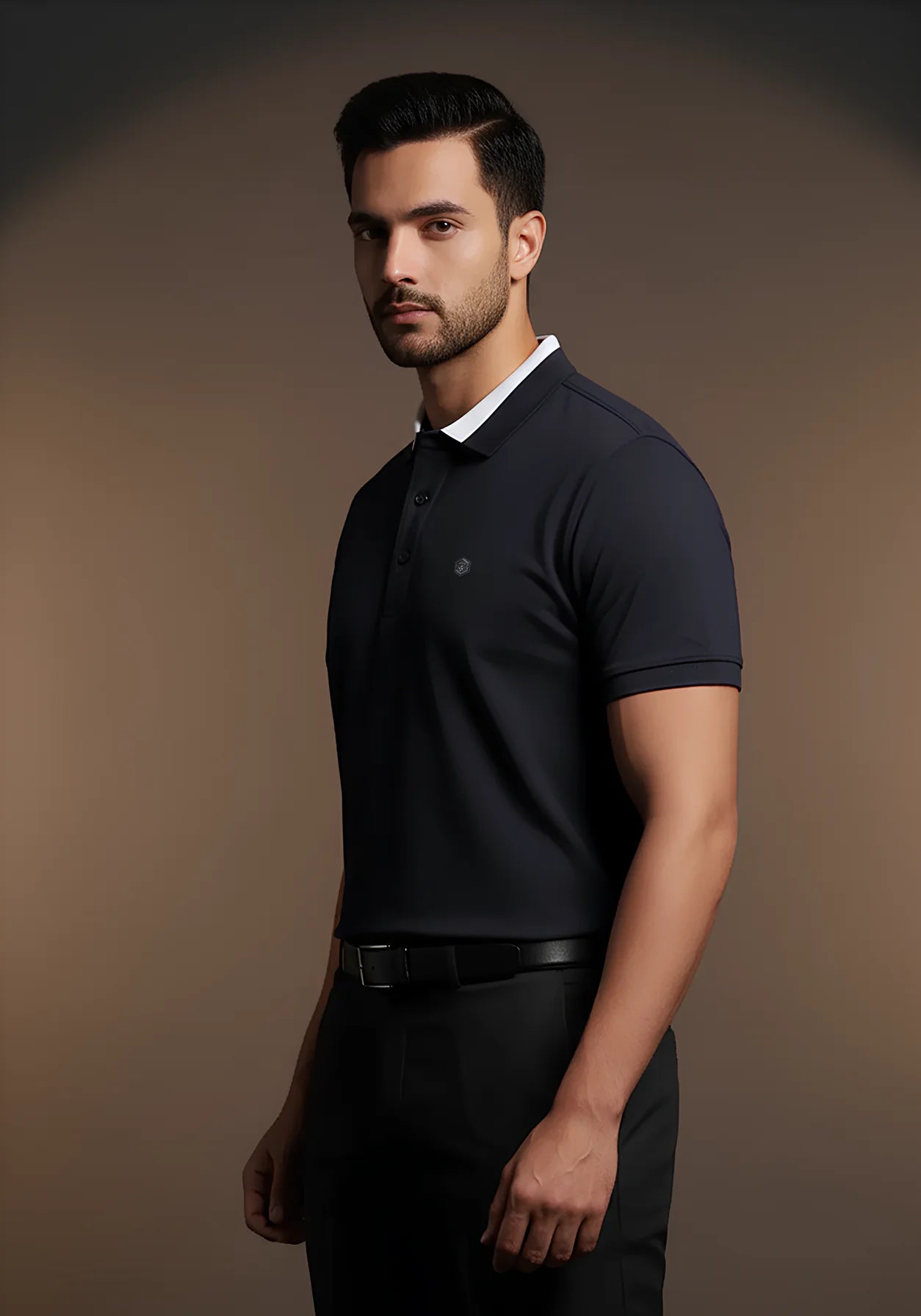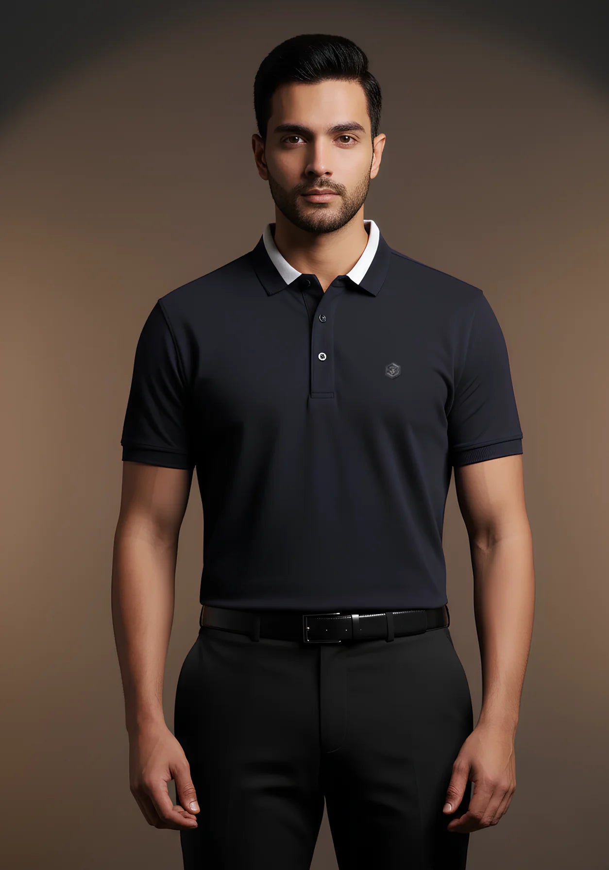 Experience timeless elegance with the Outerworld Luxury Polo T-shirt—Afterglow in black, featuring a crisp white and black waffle collar that adds a contemporary twist to a classic silhouette. Crafted from the finest mercerized cotton, this polo offers an ultra-soft feel and exceptional comfort, with a tailored fit that elevates your casual wardrobe to new heights of luxury. The metal badge adds a hint of luxury, making this piece unlike any other in your wardrobe.