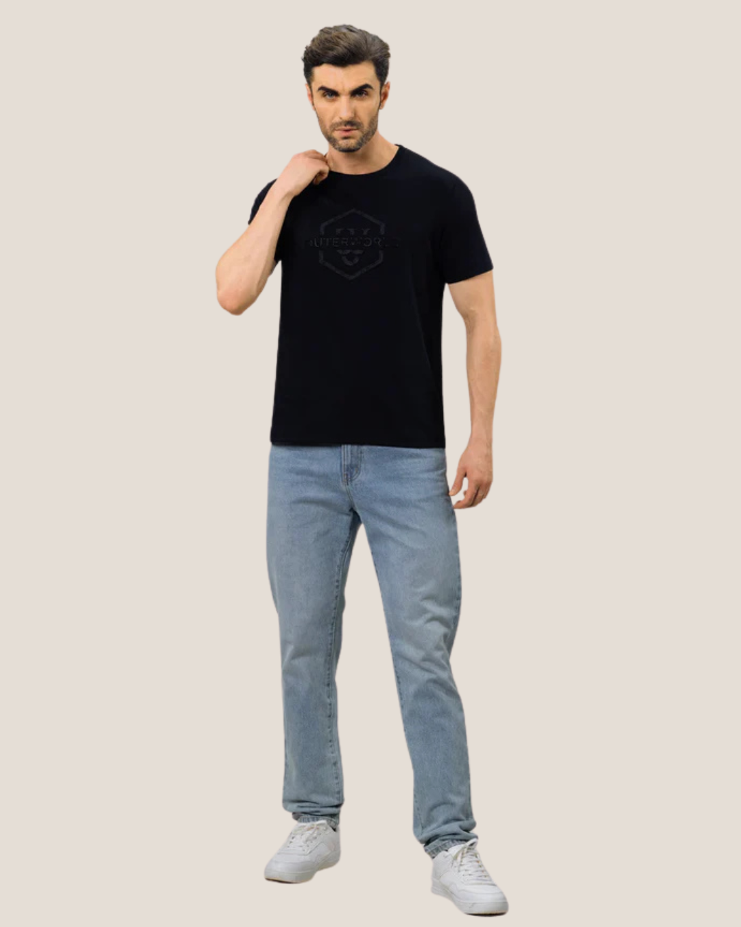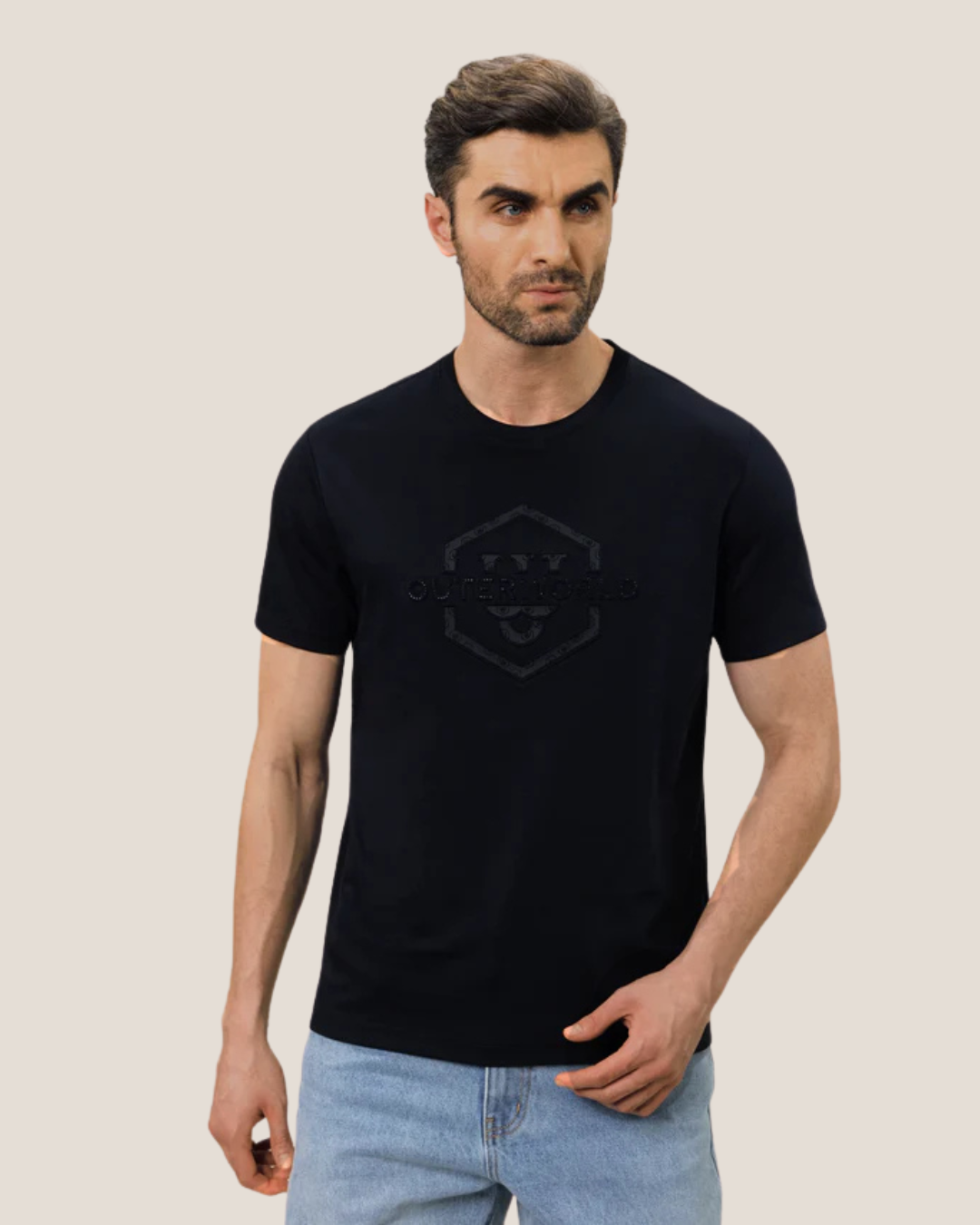 Highlighting distinctive flair, the Outerworld Black Luxury T-shirt — Black Diamond, is crafted from the finest mercerized cotton. The Outerworld emblem stands out with its cutting-edge tone-on-tone design, amplified by intricate embroidery that adds a dynamic touch. A sartorial triumph from the AW24 Party Drip collection, this Black Crew Neck T-shirt is designed for trendsetters with an eye for detail.