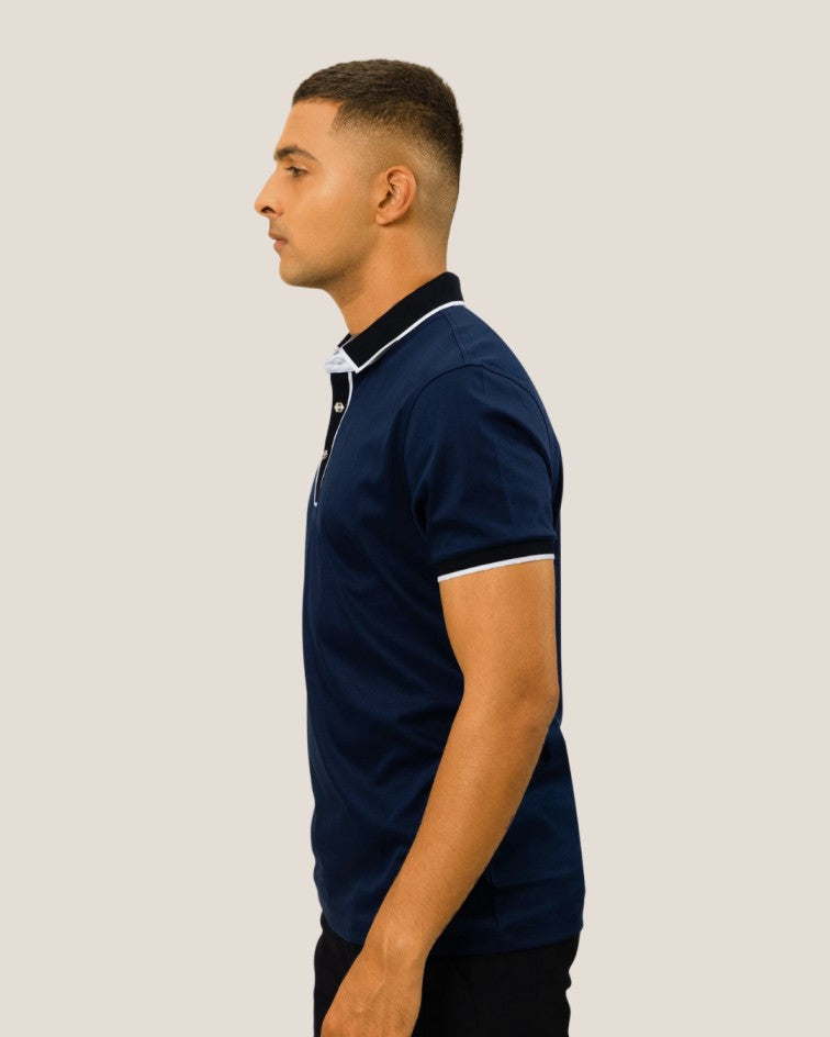 Designed for those who want to exude sophistication, the Outerworld Luxury Polo T-shirt—Midnight Majesty is a Navy Blue polo with a black edgy collar and signature hexagon button design, offering the perfect blend of modern edge and timeless elegance. The finesse of the premium mercerized cotton fabric elevates this piece, providing an ultra-soft, breathable feel with a luxurious sheen that is unmatched. This polo is a must-have addition to your wardrobe—an effortless piece you’ll reach for when heading out.