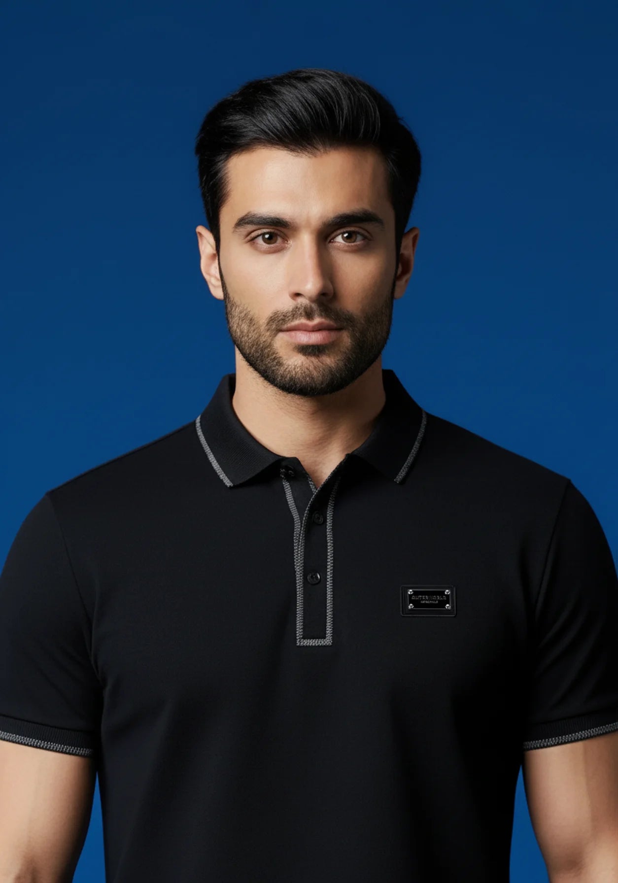Refine your wardrobe with the Outerworld Luxury Polo T-shirt, a timeless black piece that seamlessly blends classic polo styling with modern luxury. The Lurex collar is crafted with world-class finesse, while the metal badge adds a touch of matchable sophistication. Made from the finest mercerized cotton, this T-shirt offers an ultra-soft, breathable feel and a tailored fit, ensuring comfort without compromising on style.