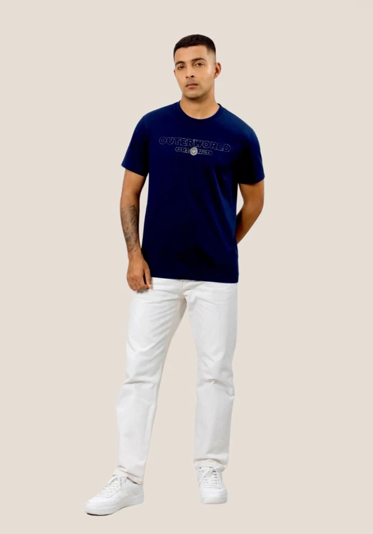 LustraCotton™Add a touch of sophistication and style to your wardrobe with the Outerworld Luxury T-shirt— Vibing blue ,is a rich, Navy blue, featuring a sleek dark blue logo design. Made from the finest mercerized cotton, this T-shirt delivers a luxurious, ultra-soft feel against the skin, offering both comfort and elegance. From the AW24 Party Drip Collection,