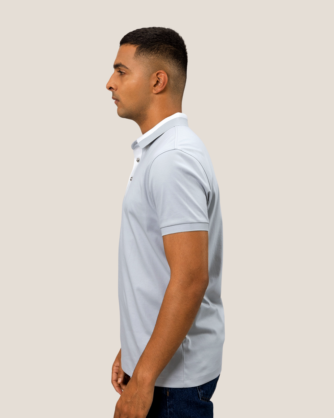 Make a statement with Outerworld's Sterling Grace Polo—a perfect blend of refined sophistication and modern design. Thoughtfully crafted from 100% premium mercerized cotton, this polo is tailored for those who appreciate timeless elegance with a unique twist. The soft grey fabric is elevated by a striking half-and-half collar and placket, offering a contemporary contrast that exudes understated luxury. Accentuated with signature hexagon-shaped silver Outerworld buttons, this piece embodies both subtle glamour and versatility. With a spear-point collar and a regular fit, the Sterling Grace Polo transitions effortlessly from daytime sophistication to evening refinement.