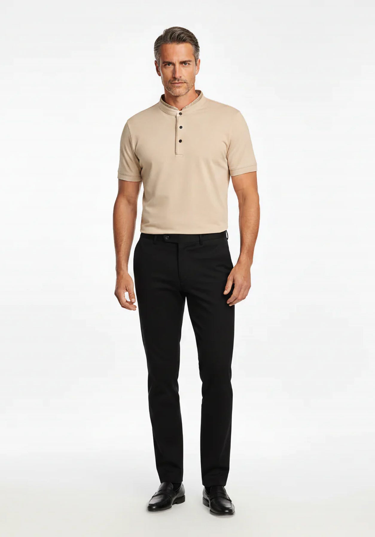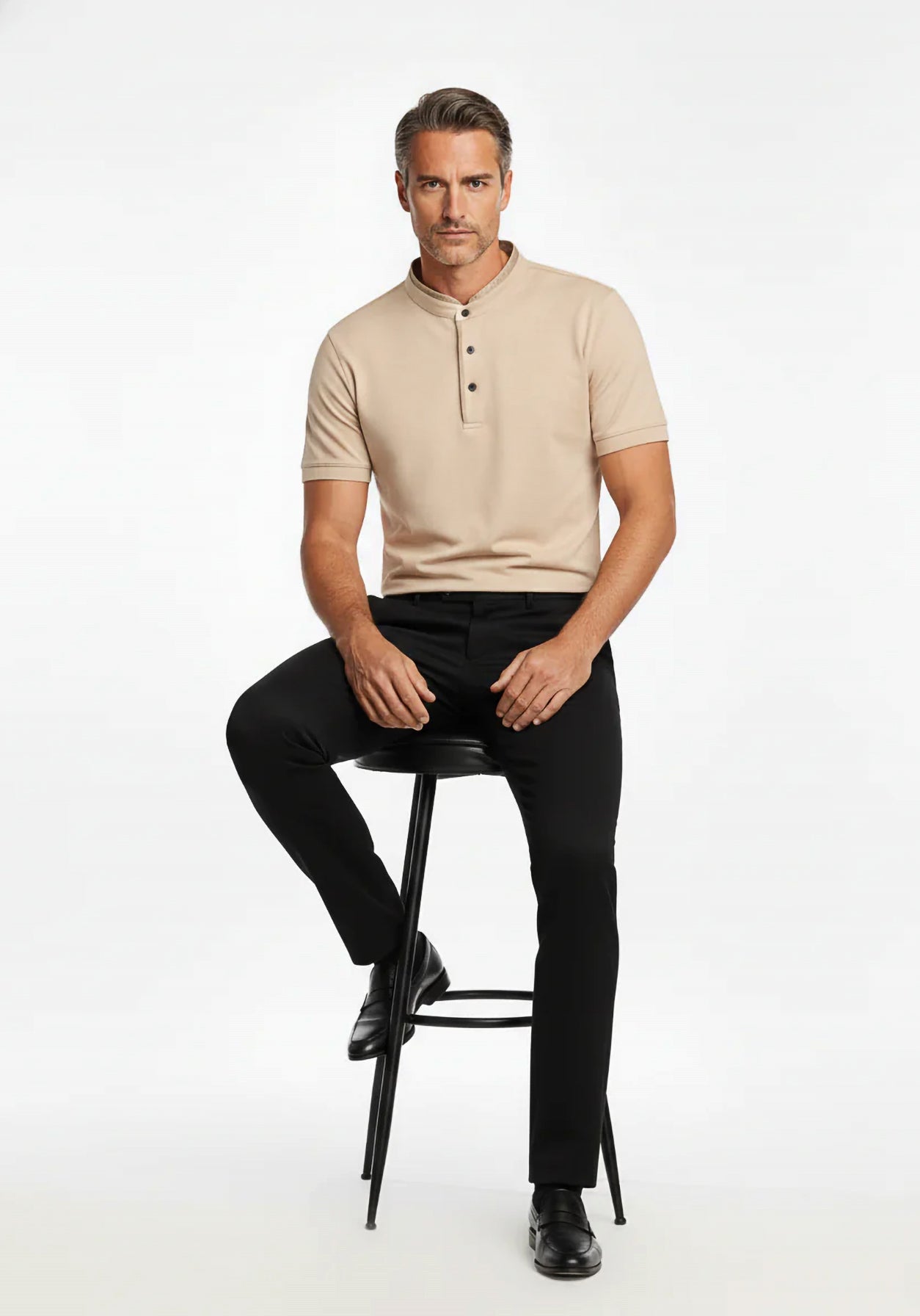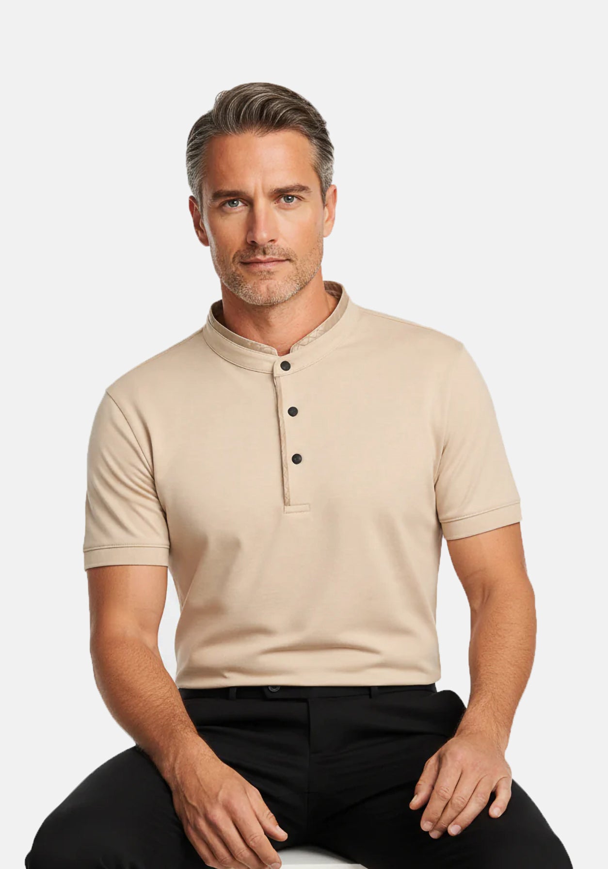 Crafted from Lustrasoft fabric, this tee delivers breathable comfort with a clean, structured drape. The leather-trim band collar adds a refined luxury accent to the elegant beige silhouette. Designed for the modern man, it transitions seamlessly from day to night—understated, versatile, and premium.
