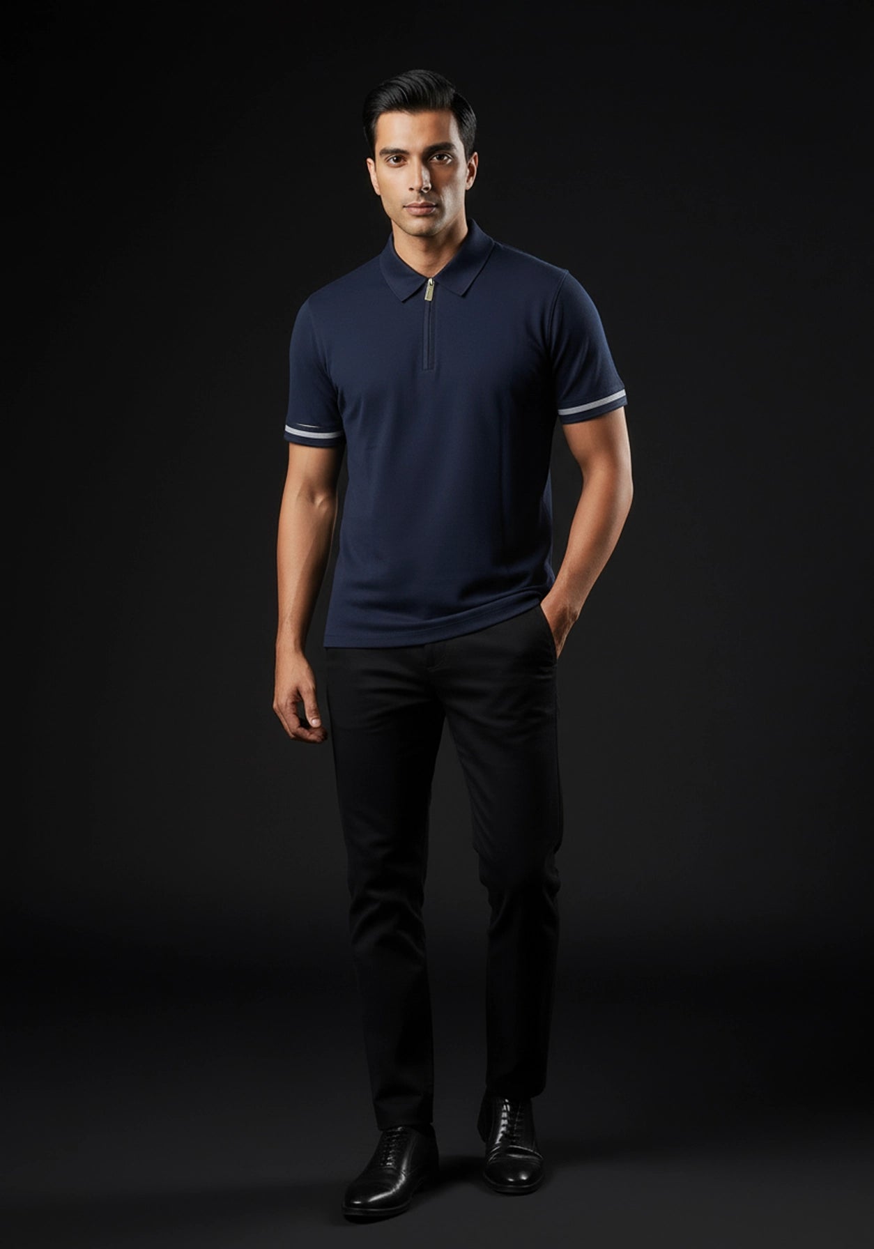 LustraCottonWoven from Lustrastrong™ cotton piqué, Classic Collar Blue Zipper Polo — Navy embodies timeless elegance with a contemporary twist. The deep navy hue offers a refined, versatile aesthetic, enhanced by a sleek liquid-finish zipper at the placket for a modern touch. Crafted from breathable piqué fabric with a luxuriously soft texture, it delivers all-day comfort and effortless wearability. The tailored fit and precise stitching create a structured, polished look. Designed for the modern man who values understated sophistication, this polo transitions seamlessly from day to night with effortless confidence.